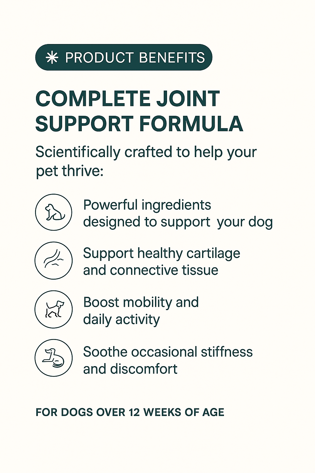 Give your furry friend the gift of mobility and joy with our advanced joint health chews, specially crafted to support small and medium breeds as they age or enjoy daily adventures.